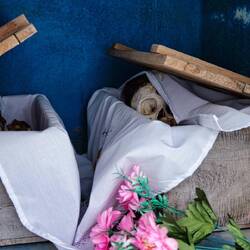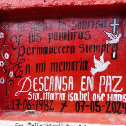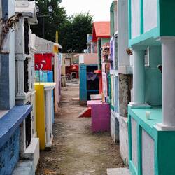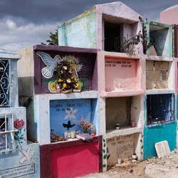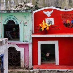 Wir sind in Pomuch, auf einem Maya-Friedhof. Der in einem kleinen Dorf liegende Friedhof ist bekannt für seine Begräbnisrituale, die tief in der Maya-Tradition verwurzelt sind. Dabei werden dieLäs mer
