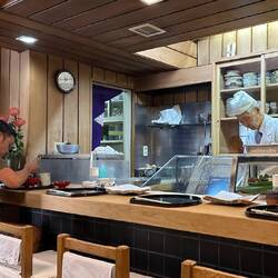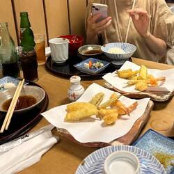 Das Mittagessen nehmen wir in einem traditionellen, kleinen Restaurant ein. Gekocht wird vom Chef Tempura direkt am Tresen, alles frisch. Tempura sind frittierter Speisen. Etwa Fisch, Fleisch oder Gemüse. Mit einem Teigmantel aus Weizenmehl, Ei und Wasser versehen werden sie heißem Pflanzenöl frittiert und nur mit Salz als Gewürz serviert.Leia mais