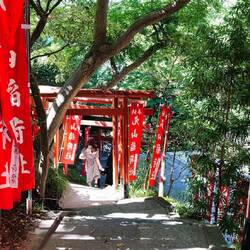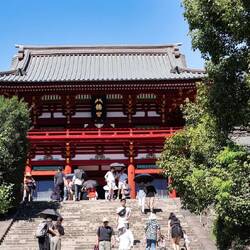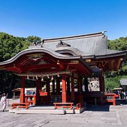 Der Tsurugaoka-Hachiman-gu Schrein, das nächste Etappenziel ist Kamakuras wichtigster Shintō-Schrein und dem Gott des Krieges Hachiman geweiht. Er wurde ursprünglich im Jahr 1063 dem 15. Tennō Ojin und seiner Frau gewidmet und 1180 an den jetzigen Standort verlegt und vergrößert. Er gilt als die Seele der Stadt Kamakura. Die Schreingebäude stammen teilweise aus dem frühen 19. Jahrhundert und wurden historisierend im Stil der Momoyama-Zeit errichtet. Der Schrein verfügt über eine von drei Torii unterteilte, von Kirschbäumen und Azaleen gesäumte Allee, sowie über einen japanischen Garten.