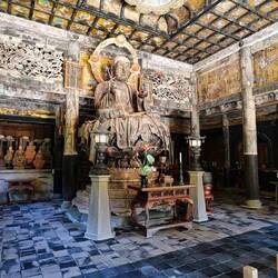 Inmitten der Haupthalle findet sich eine über 16 Meter große Buddha-Statue aus Bronze, mithin die größte des Landes. Die Halle des großen Buddha ist 57 Meter lang, 50 Meter breit und 49 Meter hoch. Damit hat sie nur noch zwei Drittel der einstigen Größe, gehört dennoch zu den größten reinen Holzbauwerken der Welt, wenn es nicht sogar das größte ist.