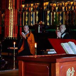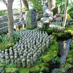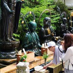 In und um Kamakura finden sich etwa fünf Tempelanlagen, die dem Zen-Buddhismus angehören. Zwei davon besichtigen wir. Der älteste, 1252 gegründet und wichtigste von ihnen ist der Kenchō-ji mit dem Zen-Garten. Er liegt nahe der Bahnstation Kita-Kamakura. Der Tempel wird bis heute genutzt. In der zentralen Buddhahalle steht eine Jizō-Botsatsu-Statue, etwas ungewöhnlich für einen Zentempel. Sie spiegelt jedoch die alte Funktion des Tales wider, als Hinrichtungsstätte. Jizō spendet verlorenen Seelen Trost.