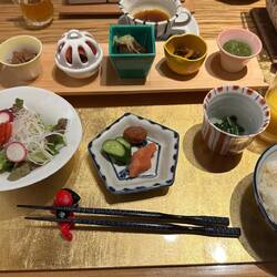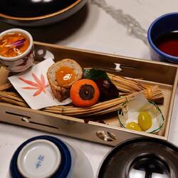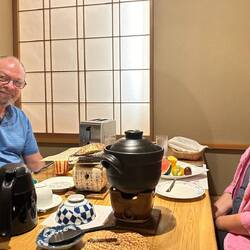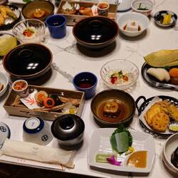 Nachdem man sich im Zimmer eingerichtet hat, bringt der Gastgeber Tee sowie kleine Süßigkeiten. Dann erfährt man auch die Zeiten für das Abendessen. Serviert wird in kleinen separaten Räumen typisch japanisches Essen. Relativ kleine Portionen aber viel Gänge. In unserem Fall waren es neun. Die Mitarbeiter tragen traditionelle Kimonos und das Haus ist im alten japanischen Stil eingerichtet.