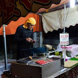 Den letzten Halt machten wir ein Stück weiter an einem Yatai-Straßenstand, die Teil der Kultur von Fukuoka sind. An den Ständen soll es das beste Streetfood geben, dass die Stadt zu bieten hat. Wir entscheiden uns für gegrilltes Schwein und dazu einen Pflaumen-Reiswein, der vorzüglich schmeckt. Es ist schon ein Genuss, dem Koch bei seiner Arbeit mit dem offenen Feuer zuzuschauen. Nicht ohne Grund gibt es einen halbhohen Plexiglasschutz, hinter dem es dennoch schön heiß wird, da der Koch schon mal die eine oder andere hohe Stichflamme mit verdampfendem Öl produziert.