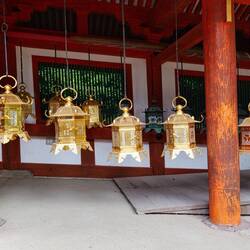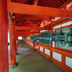 Beim Bummel durch den Park war unser nächstes Ziel der Kasuga-Taisha-Schrein, errichtet um 768 mit zahlreichen steinernen und metallischen Laternen. Es soll sich um Naras bedeutendsten Schrein mit vier Hauptgöttern und vielen Glücksgöttern handeln und er gilt als eine der heiligsten Stätten von Japans. Als Schrein zahlreicher Götter lockt er Gläubige und Touristen gleichermaßen an. Der Kasuga Taisha ist für seine Farbenpracht und seine fotogene Kulisse berühmt. Der Schrein wurde früher alle zwei Jahrzehnte neu errichtet. Dieser Brauch wurde bis zum Ende der Edo-Zeit gepflegt.