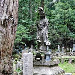 Der zwei Kilometer lange Kopfsteinpflasterweg, der nach Okuno-in führt, ist von jahrhundertealten riesigen, moosbewachsenen Zedern gesäumt. Entlang des Weges finden Sie die Gräber der Könige, Shogune, von Mönchen, Feudalherren, Kriegstoten und anderen berühmten historischen Persönlichkeiten sowie Grabsteine Unbekannter. Jedes Denkmal steht hier für den Wunsch des Verstorbenen nach Nähe zum Kobo Daihi und hält deren Vermächtnis am Leben. Besonders vom Haupteingang aus finden sich zudem zahlreiche neuere Denkmäler und Monumente von japanischen Unternehmen. Auch sie gedenken hier den Ahnen und Kobo Daishi. Faszinierend, an vielen Denkmälern der Firmen finden sich ein kleiner Schlitz, in die man seine Visitenkarte einwerfen kann, zur Kontaktaufnahme. Man bedenke, wir sind auf einem Friedhof. Eine Firma hat ein besonderes Denkmal erstellt, auf großen steinernen Tafeln finden sich zahlreiche kleine Fotos von Mitarbeitern des Unternehmens, die verstorben sind.