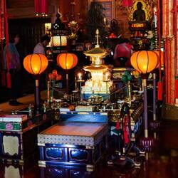 Betritt man einen Tempel, muss man über eine erhöhte Schwelle treten und darf niemals direkt auf diese treten. Hier gibt es neben dem Reinigungsbrunnen auch Räucherstäbchen, die man zur Heilung oder Reinigung verbrennt. Dabei darf man niemals ein anderes Räucherstäbchen verwenden, um seines anzuzünden. Ansonsten übernimmt man die Sünden des anderen. Der Umgang mit der Opferbox ist analog zu der an einem Schrein nur dass nicht geklatscht wird.