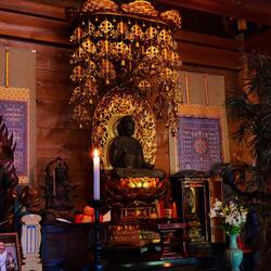 Etwas über zwei Kilometer die Straße entlang geht es dann in der sengenden Sonne zum Hase-dera Tempel, gelegen an einem Berghang nahe der Küste. Von hier aus hat man einen großartigen Ausblick über die Stadt Kamakura. Zentrum des Hase-dera ist die große Halle mit der elfköpfigen Statue der Kannon, der Göttin der Barmherzigkeit. Die neun Meter hohe, aus Holz geschnitzte Statue hat man vergoldet. Die elf Köpfe repräsentieren die Stufen der Erleuchtung. Der Legende nach wurde die Statue aus dem 8. Jahrhundert aus der Hälfte eines uralten Baumes geschnitzt. Aus der anderen Hälfte des Baumes soll man die Kannon Statue im Hase-dera Tempel in Nara geschnitzt haben, den wir noch besuchen werden.