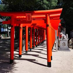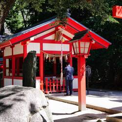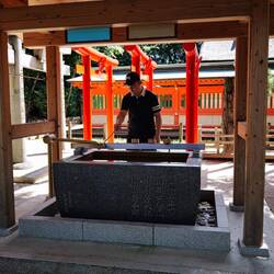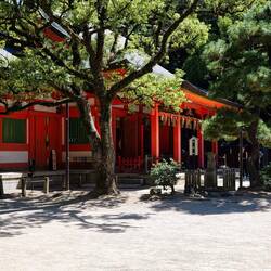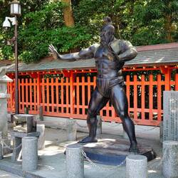 Das gesamte Gelände ist 26.800 Quadratmeter groß und von Natur und Bäumen inmitten der Stadt umgeben. Neben der Haupthalle befinden sich weitere Schreingebäude, kleine Teiche, eine Hochzeitshalle sowie eine antike Rikishi-Statue in Form eines alten Sumoringers.Leia mais