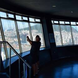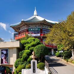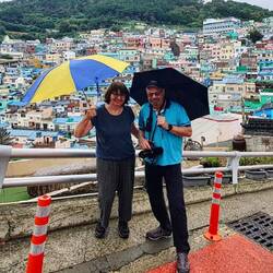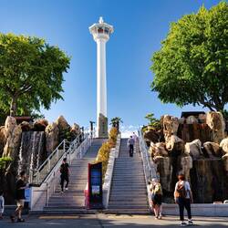 Donnerstag, 19. September: Am Morgen geht es erst mal zum Flughafen, weiter mit Korean Airlines in etwa einer Stunde nach Busan, Südkoreas größter Hafenstadt. Angekommen im Land der Morgenstille folgt die Fahrt in unser Hotel für zwei Nächte im Zentrum von Busan, einer 3,7 Millionen-Metropole, zweitgrößte Stadt Süd-Koreas. Da heute noch gutes Wetter ist und für morgen unser erster Regen auf dieser Reise angekündigt wird, geht es gleich raus Richtung Busan Tower, erst mit der U-Bahn, den Rest zu Fuß. Von der Besucherplattform auf etwa 120 m Höhe des Busan-Towers hat man einen guten Überblick über die Stadt und die vorgelagerte Inselwelt. Der Turm liegt im Yongdusan-Park auf dem Drachenkopfberg. Man benötigt aber viel Fantasie, um in der Form des kleinen, gerade mal 69 Meter hohen Berges einen Drachenkopf zu erkennen. Der Turm entstand 1973 als Radio- und Fernsehturm, wurde 2021 umfassend renoviert.
