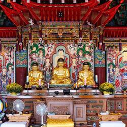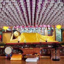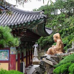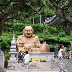 Erhöht über dem Tempel thronend überblickt der Große Gwaneum-Buddha des Meeres das Geschehen. Eigentlich ist die Bezeichnung Buddha falsch, denn es ist nur der Bodhisattva Avalokitesshvara in der weiblichen Gestalt der Gwaneum, der Göttin der Barmherzigkeit.