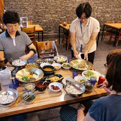 Anschließend ging es zu einem typisch koreanischen Mittagessen mit zahllosen Speisen, die wir vier uns gemeinsam teilten.Leia mais