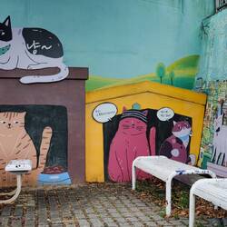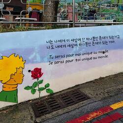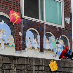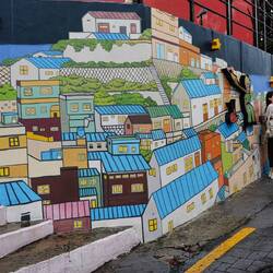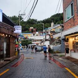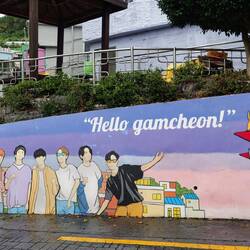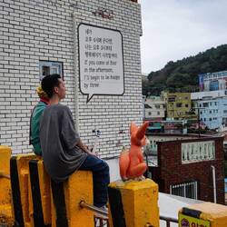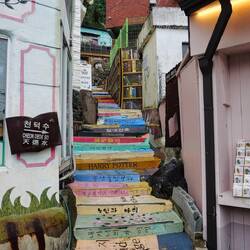 Weiter ging es zum Gamcheon Cultural Village, ein malerisches Viertel mit bunten Häusern und Kunstwerken. Gamcheon war einst ein Slum, gegründet von Flüchtlingen aus dem Koreakrieg. Nachdem 1950 Truppen aus Nordkorea fast das ganze Land erobert hatten, bis auf das kleine Gebiet im Südosten um Busan, kamen viele Flüchtlinge hier her. Sie erbauten ihre Häuser treppenförmig an den Ausläufern eines Küstenbergs. Im Laufe der Zeit verließen sie das Dorf, Häuser standen leer und verfielen. Das änderte sich ab 2009 dank einer ungewöhnlichen Initiative von Bewohnern, Studenten, Künstlern und der Lokalregierung. Sie begannen das Dorf im Rahmen des Village Art Projects zu schmücken, luden Künstler ein und stellten ihnen leere Räumlichkeiten mietfrei zur Verfügung. Inzwischen hat sich Gamcheon in eine pittoreske Ansammlung von Kunstateliers, Geschäften und Wohnhäusern verwandelt und ist zu einer Touristenattraktion geworden.