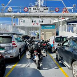 Heute Morgen scheint sich das Wetter etwas zu bessern. Ein kräftiger Wind trocknet die Straßen ab. Jedenfalls die ersten zehn Fahrminuten. Dann setzt wieder starker Regen ein. Gestern meinte ich noch, schlechter könne das Wetter nicht werden. Doch, es kann. Hinzu kommen nämlich stürmische Böen, die versuchen, einen von der Straße zu wehen. Genialer weise fahre ich für die nächsten zwei Stunden die Küste entlang - wo der Wind besonders stark ist. Eigentlich eine wunderschöne Gegend und Strecke. Wenn man etwas sehen kann. Die Wolken hängen tief und der Wind vertreibt den Regen nicht, es sorgt nur dafür, dass er mehr waagrecht kommt als senkrecht. Nach 90 Minuten komme ich an eine Fähre, die ich gar nicht erwartet hatte. Passt aber, sie steht abfahrtbereit, nach mir geht es auch gleich los. Die 20-Minuten-Passage reicht für einen Kaffee und eine Bockwurst als Frühstück. Obwohl die See recht unruhig ist, liegt der Kahn wie ein Brett auf dem Wasser, ich muss mein Moped nicht mal verzurren.