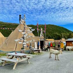 In Kautokeino hat am Montag Morgen tatsächlich das Samenmuseum offen. Diese Gelegenheit nutze ich und kann mir in Ruhe die Ausstellungstücke und das Freigelände zur Kultur und Geschichte des Volkes der Samen ansehen. Ich bin der einzige hier. Gestern kamen drei Besucher. Ansonsten hat alles andere interessante, auch Kunsthandwerksläden oder eine Silberschmiede in der Stadt geschlossen. Also weiter Richtung Alta. Die inzwischen übliche Routine auf der Straße, es hat acht Grad. Das Navi zeigt 138 km bis zur nächsten Tanke an, passend für eine Pause. Und der Tank war dreiviertels voll. Der Himmel ist trüb, die Fahrt zieht sich hin. Dann aber ändert sich die Landschaft, es wird bergiger, kurvenreicher. Gut für Motorräder. Die Sonne kommt heraus. Dann geht es zehn bis fünfzehn Kilometer entlang eines wunderschön gelegenen, schmalen Sees, an dem beidseits in den bewaldeten Hängen und auch am Ufer immer wieder wunderschöne Häuser zu sehen sind. Wochenendhäuser wohlhabender Norweger, hierher kommt man zum Angeln. Das zeigen die Boote, die vertäut auf den Wellen schaukeln. Menschen sind aber weit und breit nicht zu sehen. Gut es ist ja Montag.