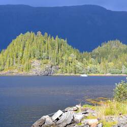 An dem Abzweig Richtung Küste fängt es pünktlich an zu regnen. Mal kräftiger, mal weniger stark. Vor der Fähre hört es wieder auf. Die 50 Minuten Fahrtdauer reichen, nachdem das Moped gut verzurrt ist, für ein Frühstück an Bord. Kaffee und Muffins. Wieder runter von der Fähre, es fängt an zu regnen. Aber nicht lange, Letztendlich wechselt sich das Wetter den ganzen Tag über ab, Wolken, Regen, am Nachmittag sogar einige Sonnenstrahlen, und das im 10-Minuten-Takt. Schade für diese Strecke. Doch spektakulär ist diese Straße auch bei Sonnenschein eher nicht, nicht der Teil den ich befahre. Auch wenn viele Reiseführer das behaupten. Sie ist sehr schön und wunderbar zu fahren, keine Frage. Aber spektakulär ist anders. Bis auf die eine oder andere Brücke. Dennoch lohnt die Fahrt auch bei miesem Wetter. Und macht Spaß. Schade nur, dass der Belag immer wieder nass ist, auf diesen kurvenreichen Straßen. Ist sie stellenweise aber abgetrocknet, kann man auch die erlauben 80 fahren. Habe ich erwähnt das das Konstante über den Tag hinweg die Temperatur ist? 12 ° Celsius. Und der kräftige Seitenwind, der einen ganz schön durchrüttelt.