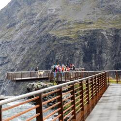Schon früher spielte die Straße eine wichtige Rolle für den Verkehr, zuerst als Pfad und anschließend als Reitweg. Im Jahr 1916 begann der Bau der heutigen Straße. Man hat die Trasse direkt in den Fels gehauen oder mit Natursteinen aufgemauert. Auch eine Steinbrücke quert man, an Ausweichstellen kann man auch mal halten (heute jedenfalls) und Fotos etwa vom Wasserfall Stigfossen machen. Jeder der elf Haarnadelkurven hat einen Namen, und zwar den des für diesen Abschnitt verantwortlichen Vorarbeiters.