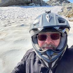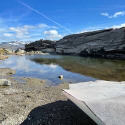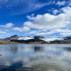 Dann kommt die nächste Passstraße. Es geht zuerst durch den Jotunheimen Nasjionalpark und anschließend durch den Jostedalsbreen Nasjonalpark. Kilometerweit - ich rede nicht von 5 oder 10, sondern von 50, 60 bis 70 km - fahre ich auf baumlosen Höhen von über 1400 m auf schön geschwungenen Straßen mit immer wieder fantastischen Ausblicken, die zu einem Stopp animieren. Rechts und links Seen, schneebedeckte Berge, Flüsse, grüne Wiesen - und ein blauer Himmel. Die Höhenunterschiede erfolgen natürlich auf Straßen mit zahllosen Serpentinen. Die Routine dafür ist längs da. Wieder ist kaum jemand unterwegs, so dass man es auch mal laufen lassen kann. Traumhaft. Hier befinde ich mich oberhalb der Schneegrenze, was natürlich ein Selfie beweisen muss.