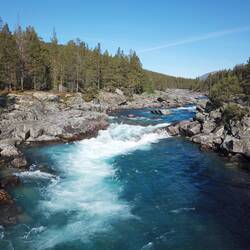 Es geht Richtung Süden, nach Alto. An Alto bin ich schon auf dem Weg zum Nordkapp vorbei gekommen, nehme jetzt aber einen anderen Weg dorthin zurück. Das Wetter ist wunderbar, es ist richtig warm, etwa 14 ° Celsius. Und ich habe heute nur etwa drei Fahrstunden vor. Bleibt also Zeit für ausgiebige Stopps. Die Gegenden, durch die ich fahre, sind es allemal wert. Die Küste entlang, manchmal auch kilometerlang durch Tunnel unter dem Meer, über Hochebenen (immerhin 350 m hoch und damit baumlos), durch Birkenwälder, bei denen die Bäume kaum mehr ein Blatt tragen, über Pässe und einen traumhaften Fluss entlang. Hier unterhalte ich mich etwas länger mit einem Norweger, der von den Lofoten zum Angeln hier her kommt. Denn in dem Fluss gibt es Lachse, so bis zu zehn Kilogramm schwer. Zur Zeit ist aber der Wasserstand niedrig, deswegen wird es wohl schwierig, etwas zu fangen. Zweimal lasse ich in wunderbaren Gegenden auch die Drohne aufsteigen, der Blick von oben ist schon etwas besonderes.