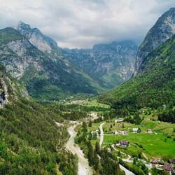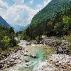 Die engen weichen langsam langgezogenen Kurven, jetzt kann man sogar wieder in den sechsten Gang schalten und die erlaubten 90 km/h auch fahren. So macht das Fahren Spaß, aber auch die engen Serpentinen haben etwas. Über Kolbarit geht es nach Tolmino, mein Ziel ist eigentlich Nova Gorica. Eigentlich. Nur bin ich ob der Stops schon etwas in Verzug, zudem ziehen am Himmel dunkle Wolken auf. Für Nachmittags ist Regen angekündigt. Und ich habe noch einen Pass vor mir, das eigentlich fahrerische Highlight mit 50 Spitzkehren, davon bald die Hälfte mit einem Belag aus Pflastersteinen. Besser, wenn die trocken sind. Also wieder Richtung Norden, wieder die Soča entlang, diesmal stromaufwärts.