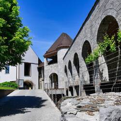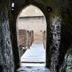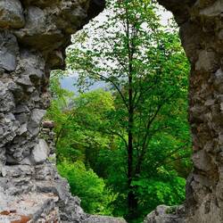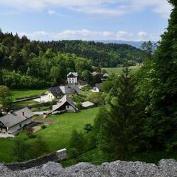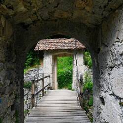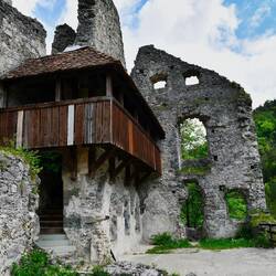 Heute Morgen machte ich mich erst mal zu einer nahegelegenen Ruine, der Burg von Begunje auf. Ich bin hier fast der Einzige. Nur auf dem kleinen, schattigen Parkplatz steht noch ein niederländischer Camper, das junge Paar übernachtet hier. Das alte Gemäuer lässt sich wunderbar erkunden, bis hoch in den Bergfried. Nur ein kleiner Teil ist abgesperrt, wegen Steinschlaggefahr durch sehr hohe, freistehende Mauern. In dunklen Räumen sieht man eine Fledermäuse umherflattern.