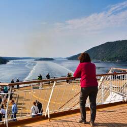 Dennoch, irgendwie ist diemal der Wurm drin. Zwei Tage später los gekommen als geplant wegen einer schweren Bronchitis die noch nicht ausgeheilt war, hatten wir noch einen schönen Abend in Bremen. Morgens dann auf die Fähre nach Oslo, die ist schon ein ganz schöner Kahn. Platz für 750 Autos, 1,2 km Ladefläche für Laster und bei 250 Mann Besatzung Platz für fast 3000 Passagiere. Natürlich Kasino, Revue, Supermarkt, mehrere Restaurants, Pubs, Kaffees und eine Ladenpassage. Ist dennoch nur eine Fähre, die von Oslo nach Kiel pendelt, Fahrdauer rund 20 Stunden über Nacht.