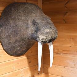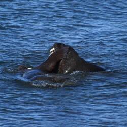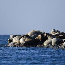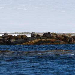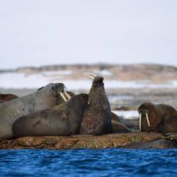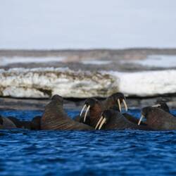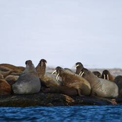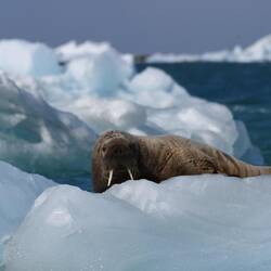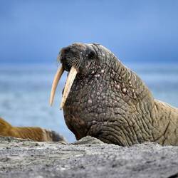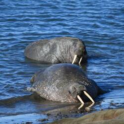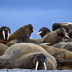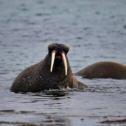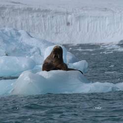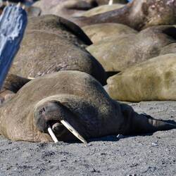 Auf Spitzbergen findet sich das Atlantik-Walross, von dem es noch um die 20.000 Exemplare geben soll. Es gibt zudem das Pazifik-Walross mit einem Bestand von 200.000 Tieren. In Spitzbergen sind sie streng geschützt, in Kanada oder Grönland werden sie noch gejagt. Das Weibchen wird etwa 3 m lang, wiegt 1200 kg, das Männchen ist 3,60 m groß und bis zu 1900 kg schwer. Das Alter lässt sich anhand der Zähne bestimmen, sie werden in freier Wildbahn um die 30 bis 40 Jahre alt. Ihre langen Zähne dienen Revierkämpfen und zur Verteidigung etwa gegenüber Eisbären. Die greifen Walrosse normalerweise nicht an, da sie sich gemeinsam verteidigen. Ein krankes Tier oder ein Jungtier, das abgesondert wurde, kann schon mal von einem Eisbären erlegt werden. Vor allem von Mollusken leben die Tiere, an einem Tag vertilgen sie um die 70 kg Muscheln, indem sie sie aussaugen. Manchmal erbeuten sie aber auch Seehunde oder Vögel. Im Wasser erreichen Walrosse Geschwindigkeiten von über 30 km/h und können bis zu 45 Minuten und bis 500 m tief tauchen. Üblicherweise bleiben sie aber nur um die fünf Minuten unter Wasser. Alle drei Jahre können sie ein Junges gebären, die Sterblichkeitsrate bei dem Nachwuchs liegt bei 25 Prozent.Läs mer