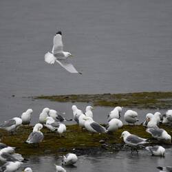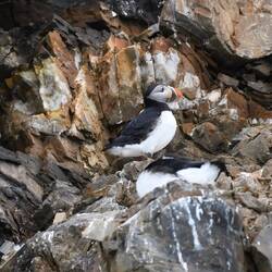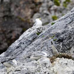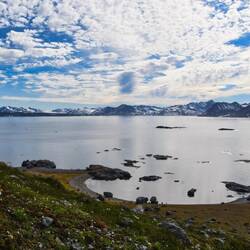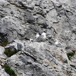 Hier findet sind etwa 100 bis 200 m vom Ufer entfernt ebenfalls ein Vogelfelsen, es ist schon irre, wie wenig sich die Vögel um Menschen kümmerten. Und es war ein Lärm, den die Vögel verursachten. Einfach schön. Man konnte bis auf wenige Meter an die Kittywakes, Trottellummen herankommen. Die um die 40 cm großen Vögel nisten in steilen Felsnischen und legen nur zwei Eier. Mehr Platz gibt es nicht im Nest. Hier sind sie scheinbar sicher vor dem Fuchs. Der streifte auf den Grünflächen herum, hält sich dort auf, wo er Nahrung erbeuten kann. Es ist der Zweite, den wir beobachten konnten. Er kann gut klettern, so dass er immer wieder Beute macht. Die Vögel attackieren den Fuchs nicht, kommt er zu nah fliegen sie einfach weg und überlassen Eier oder Brut dem Polarfuchs. Er ist kleiner als unser Rotfuchs, etwa 55 bis 75 cm und nur drei bis neun Kilogramm schwer. Und kann Temperaturen bis - 70 °C überstehen.Läs mer