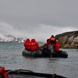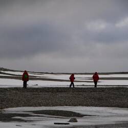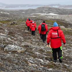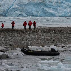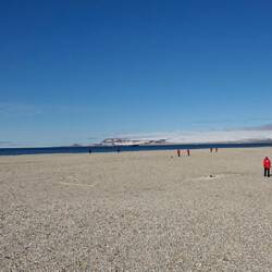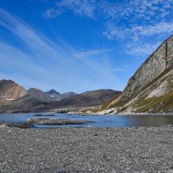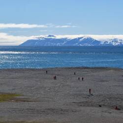 Am späteren Nachmittag erreichten wir dann die südwärts gelegenen Seven Islands. Auf der Insel Philippsøya gingen wir an Land. Auch hierfür braucht man eine Genehmigung. Für uns ist es der nördlichste Punkt auf Spitzbergen. Zuerst wird wie üblich das Gelände sondiert, nahezu jede zweite Anlandung muss abgebrochen werden oder findet nicht statt, zu viele Eisbären sind in der Gegend. Heute jedoch nicht. Mitglieder der Expeditionscrew sichern verschiedene Taleingänge von erhöhten Punkten ab, zusätzliche Zodiacs liegen am Ufer, um im Notfall die Leute schnell abtransportieren zu können. Auch im Wasser fahren Crewmitglieder mit den Tenderbooten Patrouille, Eisbären können ja schließlich schwimmen.