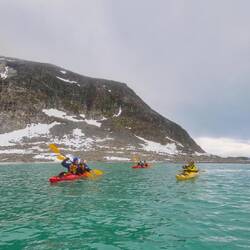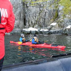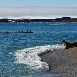 Für Elke stand aqls nächstes eine Zodiac-Tour an, während ich ins Kajak stieg. Wir waren inzwischen am Torellneset, unserem nächsten Stopp angekommen. Hier findet sich eine Walrosskolonie. Zahlreiche Tiere tummeln sich diesmal im Wasser, vor allem Jungtiere spielen in der Brandung. Ihnen kann man sich so auf 20 bis 30 Meter mit dem Kajak nähern. Wir beobachteten zwei Jungtiere in etwa 20 m Entfernung, die aber dann abtauchten und verschwunden waren. Also weiter gepaddelt. Auf einmal ein Schlag von hinten an unser Boot, sie sind direkt hinter uns beiden aufgetaucht und untersuchten und schubsen das Kajak. Alex aus den USA ist mein Paddelkollege. Ein seltenes und harmloses Erlebnis - sind halt neugierig, und die Tiere so aus der Nähe zu sehen ist schon etwas Besonderes. Anders wäre es bei einem ausgewachsenen Männchen, hier heißt es Abstand gewinnen. Dann wäre es tatsächlich gefährlich. Zu den Walrossen mehr in einem separaten Footprint.
