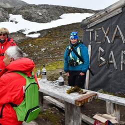 Die Texas-Bar findet sich etwas erhöht nahe dem Strand. Es ist eine kleine, Eisbärensichere Trapperhütte etwa aus den 20er-Jahren. Auch heute gibt es noch zwei Trapper, die hier unterwegs sind und Rentiere und mit Sondergenehmigung auch Polarfüchse jagen dürfen.
