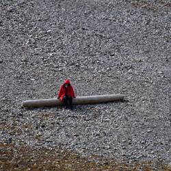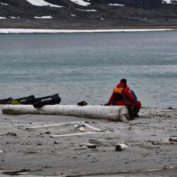 Der Strand ist übersäht von Treibholz, ganze Stämme finden sich zuhauf. Das Holz wird von Sibirien bis hier her angetrieben. Mit ihm kommt das Plastik. Es ist üblich, dass die Besucher und Guides bei Landgängen angeschwemmte Plastikabfälle und Seile, in diesem Fall sogar ein ganzes Fischernetz aus Kunststoff einsammeln, an Bord mitnehmen und im Hafen entsorgen. Drei Sack voll kommen hier zusammen, daran sieht man auch, dass hier nur wenige Schiffe anlanden. Zudem steht hier eine alte Trapperhütte von 1936. Sie wird heute noch genutzt, etwa in Notfällen oder wenn der Gouverneur Kontrollfahrten macht.Läs mer