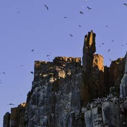 Nachmittags in Alkefjellet gleich die nächste Kajak-Tour, so waren wir an diesem Tag bald fünf Stunden unterwegs. Diesmal ging es nah an der Küste entlang, nur wenige Meter entfernt an dem rund 100 m hohen Cliff. Es erinnert an eine Skyline einer Stadt mit Wolkenkratzer. Das war ein weiterer Höhepunkt dieser Tour. Hier brüten um die 60.000 Pare Dickschnabellummen, in kleinsten Nischen im steilen Fels. Rings um uns herum flattern und schwimmen tausende Vögel, teilweise nur einen Meter entfernt. Zu Starten von der Wasseroberfläche brauchen sie einen langen Anlauf, schon lustig die etwa 40 cm großen Vögel dabei aus nächster Nähe zu beobachten. Die Geräuschkulisse, einmalig. Auch der Geruch.