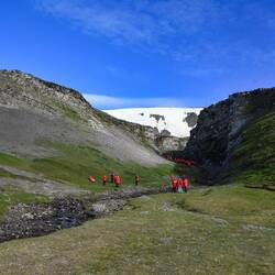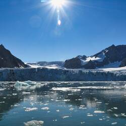 Donnerstag, Tag 15: Am Morgen lagen wir bei Sonnenschein vor dem Gletscher Brasvellbreen mit wunderbaren Ausblicken auf die Eismassen. Auch dieser Gletscher verändert sich deutlich durch die Klimaerwärmung, so fließt das Schmelzwasser heute unterirdisch ab, da sich viele Gletscherspalten gebildet haben. Früher vor einigen Jahren floss das Wasser oberirdisch ab, bildete an der Abbruchkanten wunderbare Wasserfälle. Die gibt es nicht mehr, dennoch lohnt der Blick.