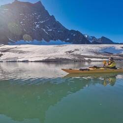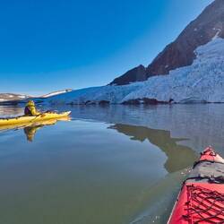 Nachmittags gleich ins Kanu bei Samarinvågen (Tour Nr. 6), während Elke eine Zodiak-Tour machte. Es ging etwa 4,5 Kilometer in der Bucht zu einem fantastischen Gletscher, bei Windstille, glatter See und 10 °C. Wir haben schon bald fünf Tage Sonnenschein, seit wir die Packeisgrenze verlassen haben. Jetzt ist keine Wolke am Himmel zu sehen. Mehr als ungewöhnlich, wie unsere Kajakguides Eloisas aus Argentinien und Eduardo aus Peru erzählen, und das bisher beste Wetter in dieser Saison. Traumhaft mit dem Kajak hier entlang zu paddeln. Deswegen macht man solche Reisen, und der Eisbären und Walrosse wegen, natürlich. Ein junger Buckelwal ließ sich in dieser Bucht auch noch blicken.