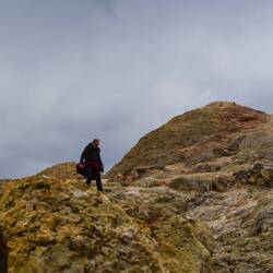 Die Insel besteht vorwiegend aus eben diesem Vulkan, der 391 m aus dem Meer herausragt. Das Besteigen ist seit zwei Jahren aus Sicherheitsgründen verboten, zu viele toxische Gase. Die strömen auch nahe dem Hafen aus dem Erdboden, so dass sich die Felsformationen gelb gefärbt haben. In einem größeren Schwefelpfuhl suhlen sich Besucher – respektive suhlten sich. Denn das Schlammbad ist seit einiger Zeit geschlossen, was aber nicht unbedingt ein Hindernis ist. Der warme schwefelhaltige Schlamm soll bei Hauterkrankungen helfen, und bei Arthrose und Gelenkerkrankungen.