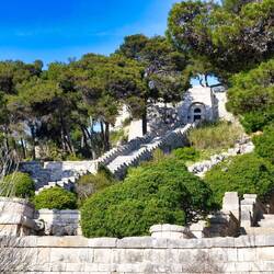 Heute wirkt das Städtchen Lipari mit den 5500 Einwohner ganz anders als gestern noch. Es scheint die Sonne, der Himmel ist blau. Also hoch zum Burgberg mit der Kathedrale San Bartolomeo. Im Süden die Bucht Marina Corta und im Norden findet sich Marina Lunga. Der Fels mit der Burg ragt imposant über die Häuser der Stadt empor. Die massive und beeindruckende Festungsmauer ist umgeben von einen bunten Gassengewirr mit Läden, Restaurants, Wohnungen, die Wäsche flattert über die Köpfe hinweg. Überall stehen Blumentöpfe dekorativ in den gepflegten und sauberen Sträßchen. Der Burgberg liegt nahe unserem Domizil, so dass wir nur wenige Minuten hoch brauchen. Oben aber halten wir uns fast drei Stunden auf. Der Grund: Die ehemalige Festung beherbergt das Archäologische Museum der Äolischen Inseln mit Funden von der Inselgruppe. Eine Sammlung prähistorischer Keramiken zeigt, wie lange die Inseln schon besiedelt sind. Dem gegenüber braucht sich die Sammlung griechischer und römischer Artefakte nicht zu verstecken. Besonders beeindruckend sind die alten Sarkophage aus eben diesen Zeiten, von denen sich zahlreiche auch im Außengelände befinden. Später haben wir noch das nahe gelegene Ausgrabungsgelände in der Stadt besucht, auf dem seit 1908 bis heute gegraben wird und viele der Sarkophage stammen. Es ist derzeit aber geschlossen. Nur waren ein paar Arbeiter zugange, die auf einem dort gelegenen Kinderspielplatz ein Spielgerät aufbauten. Schön zu beobachten, wie vier Leute mehr diskutieren, wie das Gerät aufzubauen ist, als es tatsächlich errichten. Und ein Gatter in der Umzäunung zu dem archäologischen Gelände war wegen der Arbeiter offen. Gelegenheit über die Ausgrabungsstätte zu streifen, ohne dass es jemanden störte.