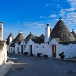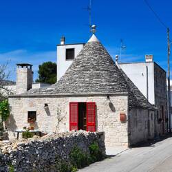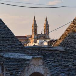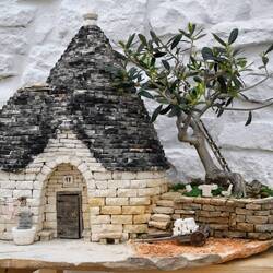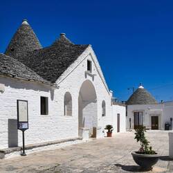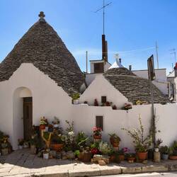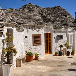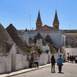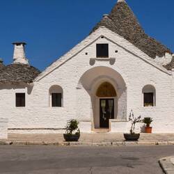 Am früheren Nachmittag erreichen wir unser Trullo, im Zentrum von Alberobello gelegen. Auch hier finden wir nicht zu weit weg einen Parkplatz, ist halt so, wenn man zentral übernachten will. Nur das nötigste Gepäck geschnappt, der Rest bleibt im Auto und hin zu unserem Domizil. Das ist schon etwas außergewöhnlich, flanieren doch Touristen an unserem Trullo vorbei und besichtigen es. Wir wohnen zwei Tage darin. Das Gebäude ist etwa 400 Jahre alt, wurde vor vier Jahren modernisiert und zu einem B&B ausgebaut. Trulli, der Plural, sind weiß getünchte Gewölbebauten aus Trockenmauerwerk mit schuppenartigen dunklen Bruchsteindächern und für diese Gegend typisch. Ursprünglich standen sie in den Feldern und nicht in einem Ort, bieten durch die Bauweise aus massivem Naturstein mit dicken Wänden und kleinen Fenstern guten Schutz gegen die Sommerhitze. Und im Winter speichert das Mauerwerk die Wärme für lange Zeit. Einst lange dem Verfall überlassen erleben die ‚Arme-Leute-Häuser‘ eine Renaissance und Alberobello ist insofern einmalig, weil hier ein größeres geschlossenes Viertel mit derartigen Gebäuden erhalten blieb. Seit 1996 zählt es zum Weltkulturerbe der Unesco. Errichtet hat man die Trulli ab dem 17. Jahrhundert, im Auftrag eines lokalen Grafen. Für feste Bauten mussten Steuern an die Regierung gezahlt werden, was er aber nicht wollte. Also forderte er seine Bauern auf, Häuser ohne Mörtel zu bauen, sondern nur aus Stein als Trockenmauerwerk. Im Falle einer königlichen Inspektion ließen sich die Trulli teilweise abbauen und später leicht wiedererrichten. So ließ sich den Geldeintreibern zeigen, dass eine armselige Ansammlung von Gebäuden etwa ohne Dach wohl kaum eine steuerrelevante Neubausiedlung sei.