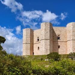 Wir sind rund 80 km nördlich von Alberobello bei Andria. Unser Ziel ist das Castel del Monte, ein ´schwäbisches´ Wahrzeichen Italiens, stammt es doch vom Stauferkaiser Friedrich II, erbaut von 1240 bis 1250. Berühmt ist es durch seine Bauform. Es ist vom Grundriss her achteckig und an jeder der Ecken steht ein ebenfalls achteckiger Turm. Über die Funktion der Burg rätselt man noch heute. Es könnte einst ein Jagdschloss gewesen sein, ein astronomisches Zentrum oder es diente zur Aufbewahrung des Staatsschatzes. Auch die Deutung als steinerne Krone Apuliens, mit der der Kaiser seine Macht demonstrieren wollte, hat Anhänger. Gern bezeichnet man es auch als Wehrbau und Lieblingssitz Friedrich II. Nichts genaues weiß man nicht, es gibt kaum Informationen aus der Zeit. Es einen sich heutzutage keine Arsenale mehr, oder Gräben und Mannschaftsräume, die man bei einer Festung erwartet. Für ein Schloss fehlen Zugbrücke, Graben, Ställe und mehr. Dafür sind am Hauptportal und den Fenstern Verzierungen vorhanden, im Inneren die Reste aufwändiger Sanitäranlagen und mehrere Kamine. Passt alles nicht so richtig zusammen. Dennoch scheint es eine ganz normale Burg gewesen zu sein. So gibt es einen Reisebericht aus dem 17. Jahrhundert, der von Resten von hölzernen Ställen und Hütten im Umfeld spricht. Die heute nicht mehr existieren und nur scheinbar fehlen. Da die Burg zudem auf einem Hügel liegt, war ein Graben nicht existenziell. Außerdem war Friedrich II ein reisender Kaiser, der mit seinem Hof in seinem Reich umherzog. Wohl kaum eines seiner Schlösser konnte den gesamten Hof beherbergen. Dafür baute man vielmehr bei jedem Besuch ein provisorisches Lager auf, mit allem, was für die Anwesenheit erforderlich war. Also war Castello presso Santa Maria del Monte – so der volle Name, wohl einfach alles: Burg, Wohnsitz, Schloss und Repräsentationssitz.