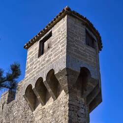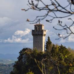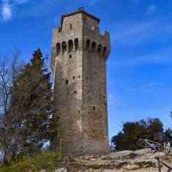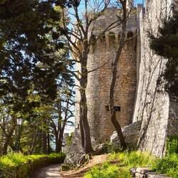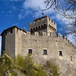 Das historische Zentrum ist seit 2008 Weltkulturerbe der Unesco. Die abgelegene Lage auf einem Felsmassiv bewahrt der Stadt ihre Mittelalterliche Prägung. Der Stadtkern ist von drei Seiten her mit den Stadtmauern aus dem 11. bis 14. Jahrhundert umgeben. Auf engem Raum finden sich zahlreiche Sehenswürdigkeiten, denen wir uns die nächste Zeit widmen. Zu Fuß, denn gebucht habe ich ein kleines Hotel im Stadtkern. Hin mit dem Auto kommen wir durch eine Fußgängerzone mit Genehmigung der Behörden, die ich mir vorher besorgt habe. Ist möglich, wenn man im Stadtzentrum übernachtet. Natürlich erwandern wir zuerst die drei Wehrtürme auf dem Monte Titano; Wahrzeichen von Stadt und Republik San Marino.
