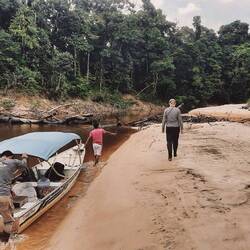 Er befestigt das Boot und steigt triefend nass aus diesem aus und geht ins Lager. Dort leert er erstmal seine Stiefel, in denen der halbe Amazonas war.
