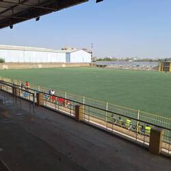 Das Stadion ist unspektakulär, hat zwei Tribünen auf den langen Seiten, wovon aber nur die eine überdachte geöffnet ist.