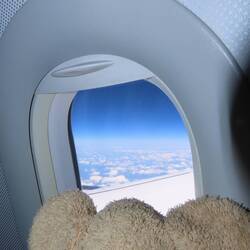Der Flug von München nach Düsseldorf war nur spärlich gebucht. Die Chance für Teile der Plüschie-Reisegruppe, um sich einen freien Sitzplatz zu erobern.