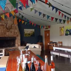 The tasting room and bar area was lovely - decorative bunting, a log fire, sofas, a pool, long wooden tables, and spectacular views of the vineyards and the mountains behind.