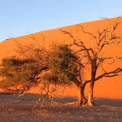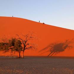 It was freezing cold and blowing a gale as we started out. Laban advised us to climb on the corner of the dune, preferably stepping into someone else’s footsteps. I set off with good intentions, but soon faltered. The wind was really strong and I felt very unsteady on my feet. About a third of the way up, I stopped and sat down to wait for sunrise. I was soon joined by Kris and Trish. I noticed that Mark, Natasha, and Kim had stopped a little further up. We watched the changing sky for a while, but it was bitterly cold with a biting wind. Other people were climbing the dune past us and we were getting sand in our faces. It wasn’t much fun, so we descended before the sun actually appeared. It really didn’t matter. We still saw the sunrise from ground level, and were in the best place to see the dune turn a vivid red in the sun, and to see the shadows cast by the trees on the dune. Nature certainly put on a show for us! We both took some lovely photos.
