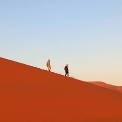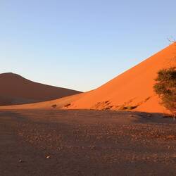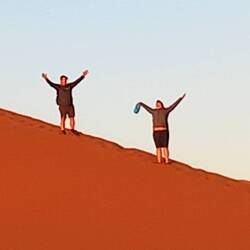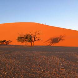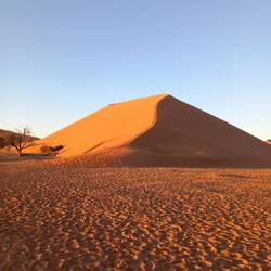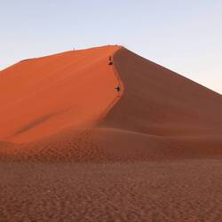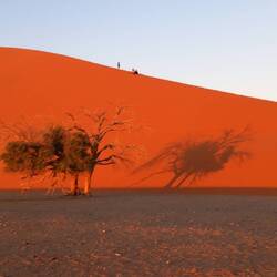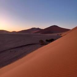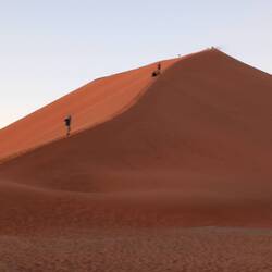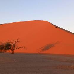 When we arrived at the dune, we set off to the top to get the best view when the sun rose. Dune 45 is the oldest dune in Namibia. Its name comes from the fact that it is located at the 45th kilometre of the road that connects the Sesriem gate and Sossusvlei. It stands at over 170 metres tall and is composed of five million-year-old sand that is detritus accumulated by the Orange River from the Kalahari Desert and then blown here. It is red in colour because of the amount of iron oxide in the sand. Younger dunes are white, not red.