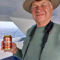 Inside the boat, I watched as one of the crew shucked a whole tray of oysters and prepared our buffet lunch. We had this with a South African sparkling wine, which was really good. Sherry, beer, and fizz – all before 11 o’clock in the morning! Not everybody wanted oysters, so Mark had half a dozen with a splash of Tabasco and a drop of lemon juice. He thoroughly enjoyed them.