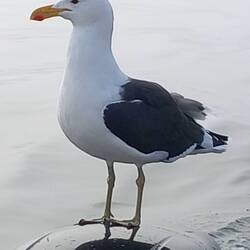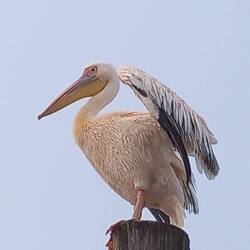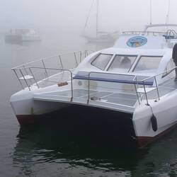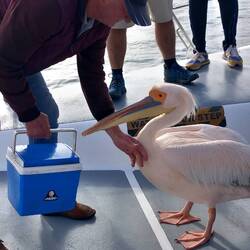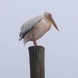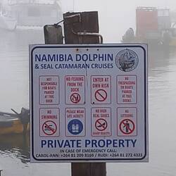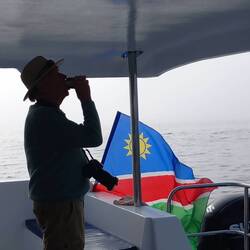 Our pick up was on time. After collecting more guests from other hotels around town, we set off for Wavis Bay, 20 kilometres away. It was very foggy, so we could see little as we drove along. When we got there, we had to wait a short time for our boat to arrive. There were lots of people going out on different boats. Ours was a catamaran called Mlandra owned and skippered by South African Eduard du Toit. As we waited to board, there was a pelican on a post, which caused us all to stop and take photos despite the foggy conditions.