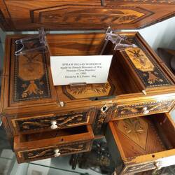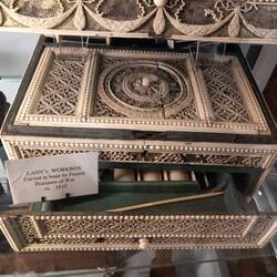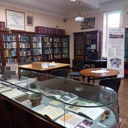 > Many examples of Whitby jet, including a medallion of Queen Victoria made by John William Barker and presented to the museum as a jubilee gift.
