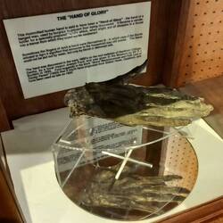 > The Hand of Glory - a mummified human hand - said to be the hand of a hanged man, used by burglars to prevent them being discovered. The hand became a candle holder for a special candle which, when lit, put all the sleepers in a house into a trance from which they couldn't be roused. Sometimes, the fingers of such a hand were lit, in which case, if the thumb 👍 refused to light, it meant someone in the house was still awake. The flame 🔥 couldn't be put out with water. It could only be put out with blood or milk. The hand on display in the museum was found in the early 1900s and donated to the museum in 1935. Experts believe it could have been used as late as 1820.