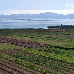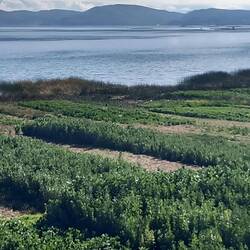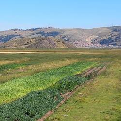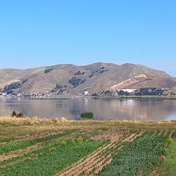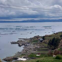 Once on the road, we drove along the banks of Lake Titicaca. The land here is very fertile and every inch is planted with vegetables. The lake is full of anchored nets to catch fish.